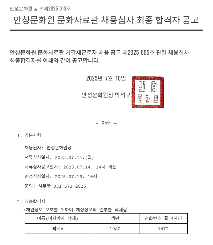 안성문화원 문화사료관 기간제근로자 채용심사 최종 합격자 공고