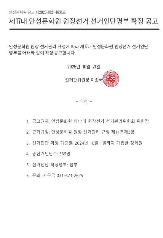 제17대 안성문화원 원장선거 선거인단 명부 확정 공고