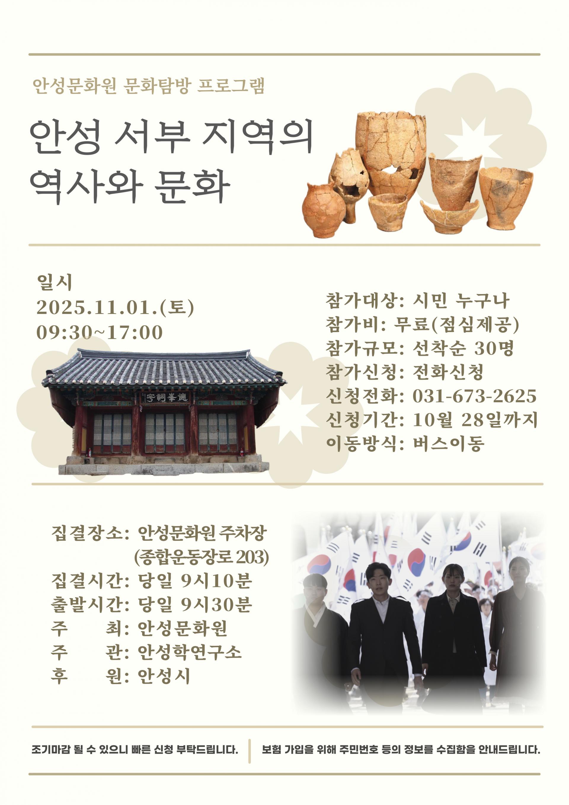안성시 지원으로 진행되는 ‘안성 서부지역의 역사와 문화탐방’이 아래와 같이 진행될 예정이오니 많은 관심과 홍보, 참여 부탁드립니다.