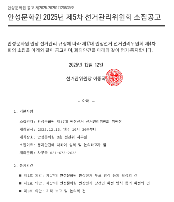 제17대 안성문화원 원장선거 선거관리위원회 제5차 회의 소집공고
