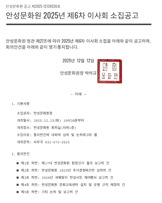 안성문화원 제6차 이사회 소집공고